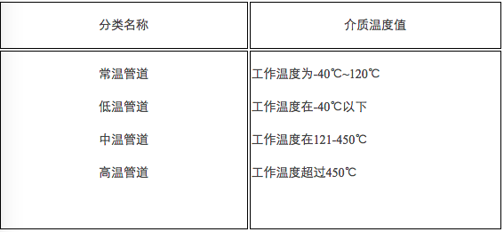 根據(jù)管道工作溫度不同分為低溫、常溫、中溫和高溫管道,其劃分標(biāo)準(zhǔn)見(jiàn)表1-1-8。